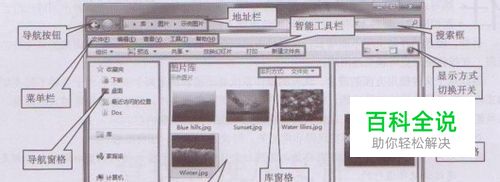 根据图1所示,win7旗舰版Windows资源管理器中每个界面元素的含义和用途如下。