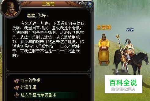 2.进入“千里走单骑”副本,并打通(其实你只要在黄河渡口那关干掉夏侯惇边的那个信使就算通关了,不过那也不是件很容易的事) 3.胜利通关,找王富商交任务,获取奖励。