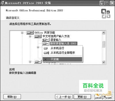启动时打开常用输入法 通常只要一打开Word 2003就会自动切换到“微软拼音输入法”,如果你惯用的不是这种输入法恐怕就会觉得很困扰了。能不能让Word启动时自动打开我们惯用的输入法呢?这其实并不难做到。 依次打开“控制面板→添加或删除程序”,从列表中找到“Microsoft Office Professional Edition 2003”项并单击“更改”按钮。在Office 2003安装窗口中点选“添加或删除功能”单选项并单击下一步,接着勾选“选择应用程序的高级自定义”复选框再单击下一步,从中间的列表中依次展开“Microsoft Office→Office共享功能→中文可选用户输入法→微软拼音输入法 2003”,单击“微软拼音输入法 2003”前的按钮选择“不安装”(如图2),单击“更新”按钮。等安装完成以后再进入Word时出现的就不是微软拼音输入法了,而是输入法列表中排在首位的中文输入法。最后只要让常用的输入法排在首位即可。 如果你不希望Word在启动时自动打开中文输入法,那么还有另一个更简单的办法可以使用。依次选择“工具→选项”菜单命令,在出现的对话框中选择“编辑”选项卡,取消勾选其中的“输入法控制处于活动状态”复选框即可。