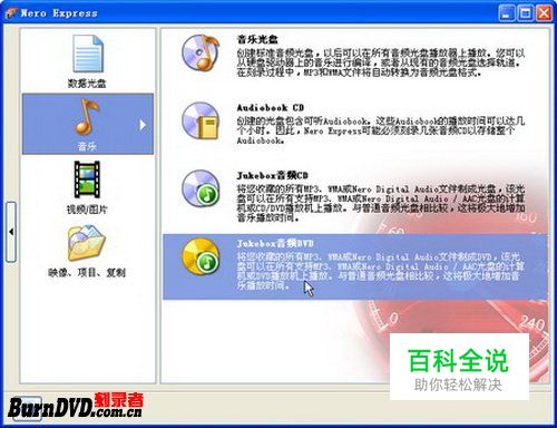 Nero Express 7.10.1.0是Nero 7 Premium的简易刻录组件,同样可以实现数据光盘、音频光盘、视频光盘的刻录,并具备光盘的复制功能。另外,V7.10.1.0版本的Nero Express还具备制作Jukebox音频光盘的功能,可以将MP3文件、WMA文件等音频文件制作成一张Jukebox音频CD/DVD,可以在任何支持MP3、WMA或AAC文件播放的电脑或播放机中进行播放。而在以前版本的Nero Express 7中,用户只能制作MP3音乐光盘、WMA音乐光盘等相对单一的音乐光盘,如图2009011613所示。 图2009011613 Nero Express 7.10.1.0程序界面