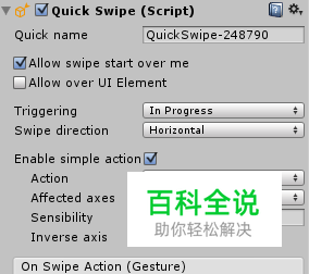 2、上图中的场景一共展示了下列手势:(1)Touch:触摸手势(2)Tap:点击手势(3)Long Tap:长按手势(4)Drag:拖动手势(5)Enter Over Exit:滑过手势(6)Double Tap:双击手势(7)Swipe:滑动手势(8)Twist:扭转手势(9)Pinch:两个或多个手指挤压,常用于缩放 3、 EasyTouch初始化 EasyTouch初始化的方式非常简单,我们只需要在场景中创建一个空的GameObject,然后将其命名为EasyTouch,然后在Inspector面板上点击AddComponent添加EasyTouch.cs脚本文件,这样就完成了EasyTouch的初始化。 旋转模型 初始化模型的工作完成之后,接下来我们演示旋转模型的实现方式,我们查看前面提到的案例场景中的Horizontal Swipe下的物体,我们发现当我们用鼠标在该物体上左右滑动时,就可以让物体发生水平方向的旋转,我们查看被旋转物体上的组件信息,发现该物体拥有一个名为QuickSwipe的组件。 因此,只要我们给需要旋转的物体添加QuickSwipe组件,即可让物体根据手势滑动的方向进行方向的旋转。QuickSwipe组件的参数如下图所示:
