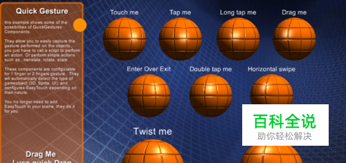 1、查看EasyTouch案例场景。正确导入EasyTouch插件之后,在Project视图中找到QuickGesture案例场景,这个场景中展示了插件中大部分手势的案例,该场景打开后的界面如下图所示: