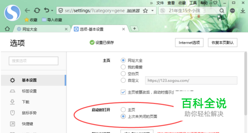 六、在“基本设置”选项卡的右侧窗格,在“启动时打开”中选择“上次未关闭的页面”即可。如图所示;