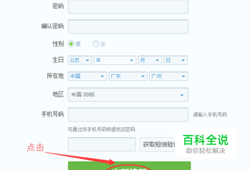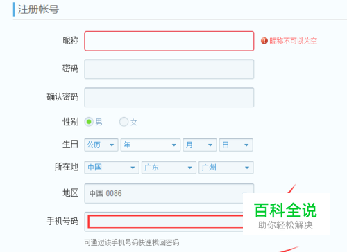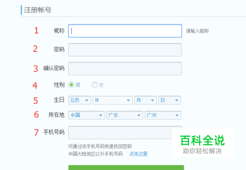 填写资料时,昵称、生日、性别、所在地 这几项资料,你可以随意填写,没有严格的限制。 需要注意的是密码和手机号码不能马虎填写。填写密码需要选择自己牢记并熟悉的数字或符号,才不会忘却才不会造成密码遗失; 手机号码这一项资料需要准确无误的填写,才能接收到短信验证码,完成注册账号。(请放心你的手机号码不会被泄露,该号码只用于接收验证码作用)