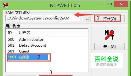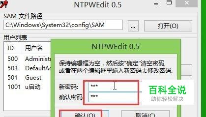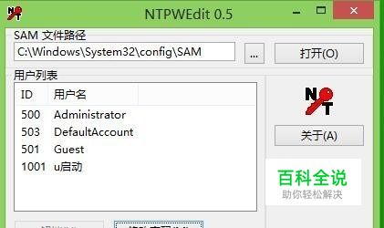 在打开的破解系统密码工具中点击开始,我们需要的是sam文件,软件会自动获取sam路径和文件,然后点击要修改密码的帐户,这边要修改u启动帐户,所以点击u启动,再点击修改密码,如图:
