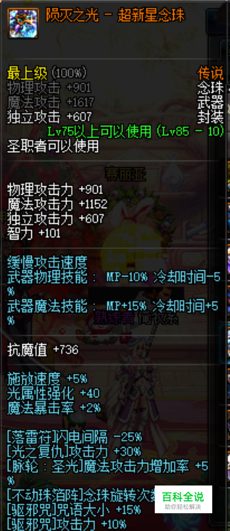 完美武器推荐“陨灭之光-超新星念珠”(【神谕之祈愿】技能攻击力增加率+12%),还可以带以下装备“大智度论” (技能Lv +3)、“祭司之哀吟” (技能Lv +3)、“卡露亚的教导-玄武” (技能Lv +2)这个装备可以在拍卖行买到。