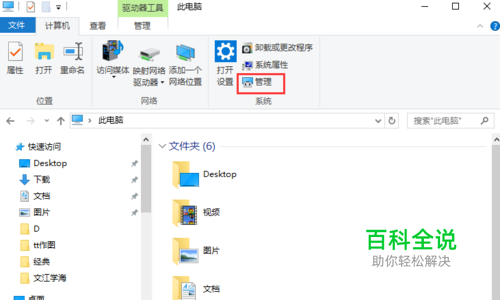 请打开win10系统“此电脑”界面,在其中可以看到有一项是“管理”。请点击该选项。