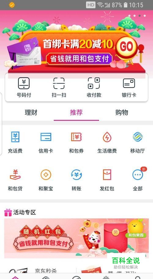 安装并且运行和包支付APP,需要注册成功才能使用。在APP首页中部,有活动专区,能看到带有“随机红包”字样的横幅画面,点击进入。
