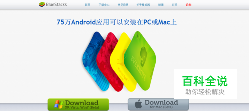 首先,我们需要搜索一款名为:BlueStacks的安卓模拟器软件。打开首页会出现下载链接,选择你需要下载版本。我们这里选择PC,PC版支持XP、Vista、Win7(Beta)。建议使用Win7系统,下载完成后解压安装。