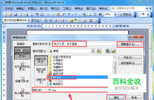2. 在“查找范围”框中找到并选择一个新的目标文件或直接输入一个新的目标地址,重新编辑“要显示的文字”中输入新的文字作为超链接的显示,单击“屏幕提示”继续编辑新的提示文本,都编辑完成以后点击“确定”即可。