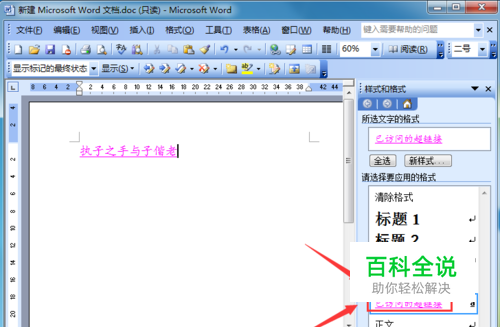 3.打开需要更改的超链接所在的文档,选定该链接,然后点击“格式”——“样式和格式”选项,在文档右侧则显示“样式和格式”的任务窗格。