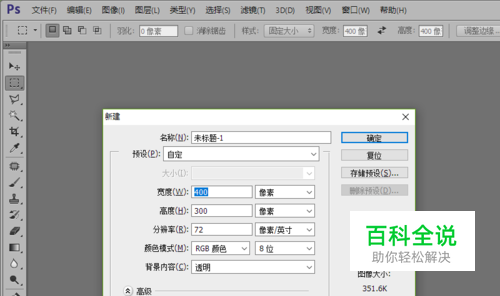 打开ps,点击“文件-新建”或者快捷键“Ctrl + N”,以400*300为例。