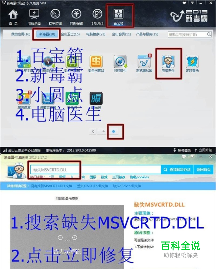 杀毒软件中“电脑医生”提供了一键修复“缺失MSVCRTD.DLL”的问题,可以对电脑自动做出下列修复
