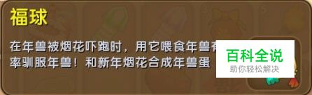 福球的用途1:在年兽被烟花吓跑时,用它来喂食年兽,有几率驯服年兽哦。
