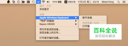 如下图所示,在正常情况下,当把蓝牙状态图标放到系统顶部状态栏的时候,可以很快速地发现并连接蓝牙设备。在这里可以看到当前这台 Mac 电脑已经连接上了一个 Apple Wireless Keyboard 键盘。