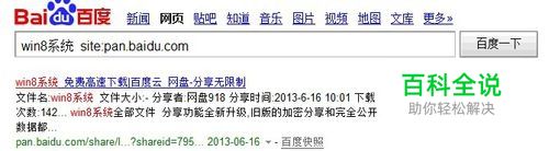 在搜索框内输入你要搜索的资源,如win8系统,然后在后面加上 site:pan.baidu.com 搜索一下看一看,是不是全是百度网盘的资源。