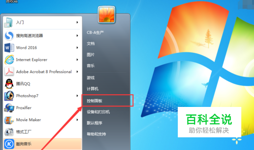 点击桌面左下角的Win图标,然后点击“ 控制面板”选项。