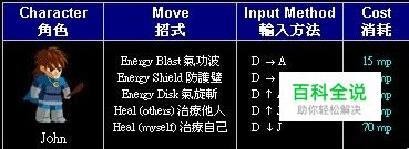 关于john的出招非常简单,主要有5个招。 1、气功波(守前攻) 2、防护壁(守前跳) 3、气旋斩(气施斩) 4、治疗他人(守上跳) 5、治疗自己(守下跳)
