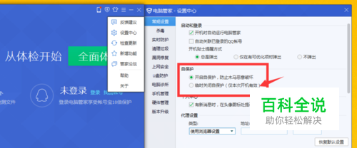 在设置中心--常规设置--自保护中选择临时关闭自保护(仅本次开机有效) 并点击应用或者确定。