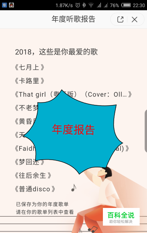 点击后打开的界面,就是年度听歌报告,在年度听歌报告的最后一页,就是年度最喜欢的歌。如图所示