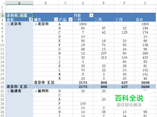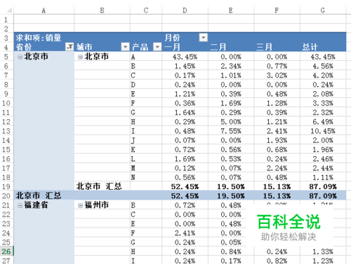在父级汇总的百分比计算方式下,选择不同的单元格所得的结果不一样。 选择一级单元格计算父级汇总的百分比时:
