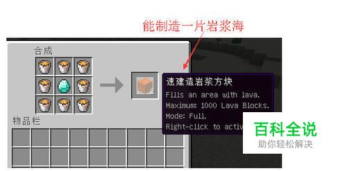 快速建造一片岩浆池 合成方法是:用八个岩浆桶+一颗钻石,在工作台中合成【速建造岩浆方块】 得到【速建造岩浆方块】后,把方块放在坑中,用法杖点一下,就OK了。