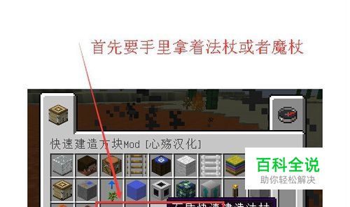 首先你要有一把法杖 如果你的该mod是汉化的话,也可能叫魔杖,材质任意一种都可以。这样,就能让下面制作的特殊方块实现特殊功能啦。 合成方法如下图
