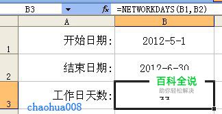在B3格中输入公式 =NETWORKDAYS(B1,B2) 最后就能在B3单元格中显示这个时间段的"工作日"为44天