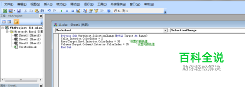 将以下代码复制到编辑框内;Private Sub Worksheet_SelectionChange(ByVal Target As Range)Cells.Interior.ColorIndex = 2Rows(Target.Row).Interior.ColorIndex = 35 '设置行颜色值Columns(Target.Column).Interior.ColorIndex = 35 '设置列颜色值End Sub 如下图所示