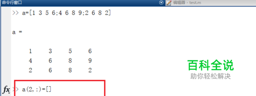 第二步输入a(2,:)=[],删除矩阵第2行,如下图所示:
