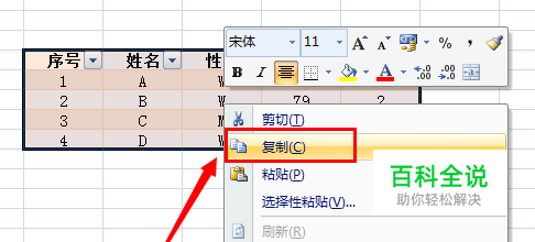 首先在Excel中,选中表格区域,右击选择“复制”。