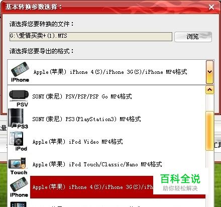 选择需要的MP4格式 导入电影文件后,即可进入“基本转换参数选择:”对话框,MP4/RM转换专家作为一款专业的移动设备专用格式转换器,它可导出符合各移动设备官方标准的MP4格式,如普通MP4机、普通手机,PSP、PS3、苹果TV、iPhone、iPod、iPad,而且导出的电影都能在这些机子上清晰流畅播放。