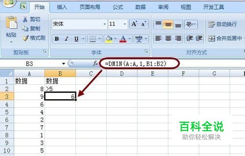 我们需要计算其中满足大于5的数字中,最小的一个数字。 这时,可以在B列第1个单元格,填写与A列一样的标题。 然后,在B2单元格,填写条件:>5 最后,在单元格B3,输入Excel的数据库函数公式,来计算我们想要的结果。 =DMIN(A:A,1,B1:B2) 即可得到正确结果,是6 这个公式有三个参数,意义分别是 数据所在单元格区域(注意:需包含标题单元格在内) 求值时,需要计算数据区域的第几列 自定义条件所在的单元格区域(注意:同样需包含标题单元格在内)