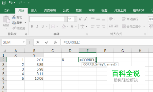 先后选中两列数据 公式为=CORREL(A2:A6,B2:B6)