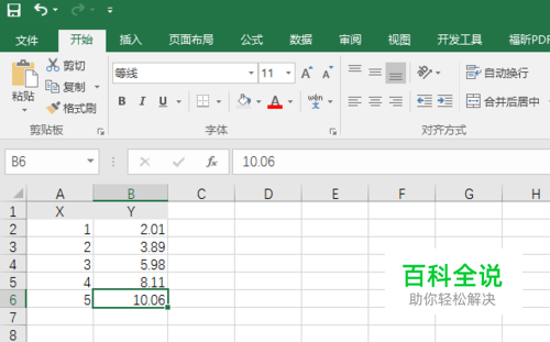 打开Excel2016,输入X、Y两列数据