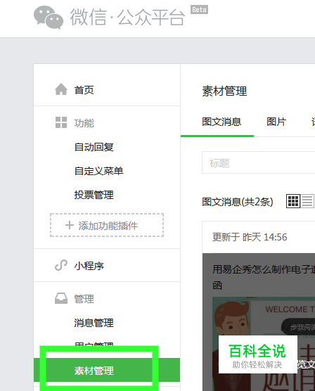 登陆微信订阅号后,找到最左边一行的“素材管理”