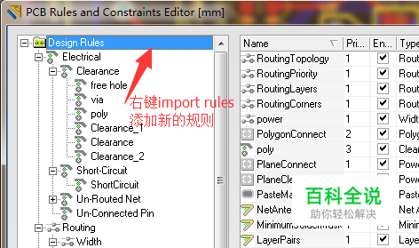 2,连线时可以重新添加规则。新的规则文件将规定导线之间的距离,安装孔的大小等参数。若导线之间距离太近的话将使导线颜色变为绿色。