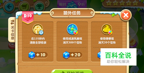 额外任务: 1)135秒内打掉全部钱袋 2)使用减速风扇消灭300个怪 3)使用便便打掉20个怪