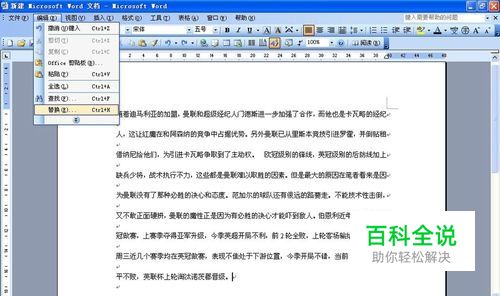 找到菜单栏的”编辑“点击,在下拉选项选择”替换“如图所示