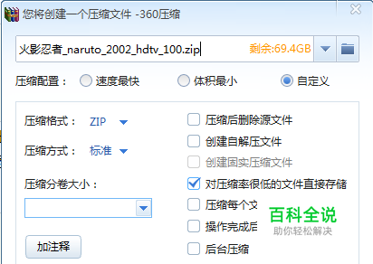 然后在弹出的对话框中我们选择自定义,详细的设置如下图所示: 另外可以添加注释,双击打开的压缩文件的时候会在右边有提示。