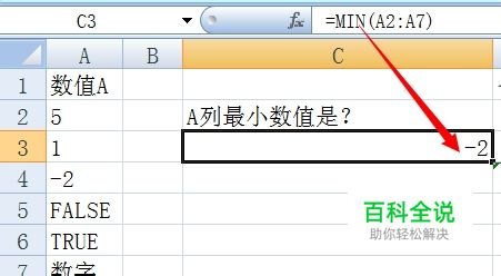 在C3单元格内输入=MIN(A2:A7),计算的结果为:-2