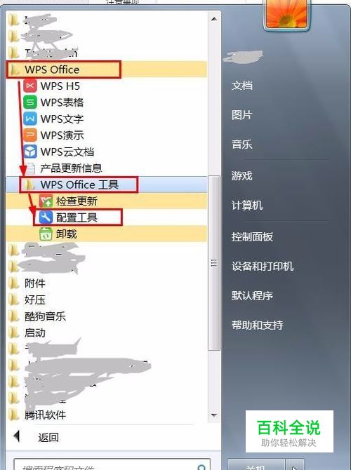 找到 WPS Office文件夹并点击它—— WPS Office工具文件夹—— 配置工具