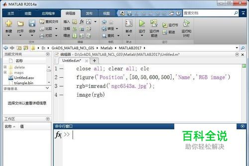 第一,启动MATLAB,新建脚本(Ctrl+N),输入如下代码: close all; clear all; clc figure('Position',[50,50,600,500],'Name','RGB image') rgb=imread('ngc6543a.jpg'); image(rgb) 该代码通过imread( )读取图片文件(ngc6543a.jpg),该图片文件为哈勃空间望远镜获得的猫眼星云照片(Cat eye's Nebula from the Hubble Space Telescope,NASA)。然后通过image( )显示该猫眼星云图片。