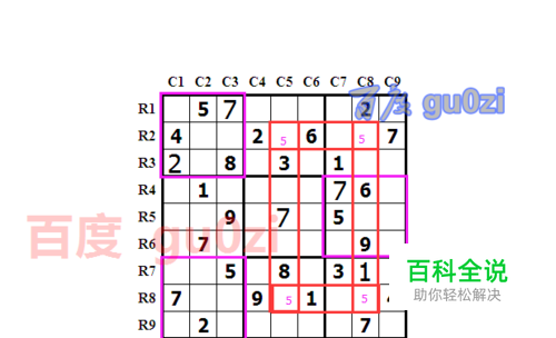 接着上一篇,我们继续。 由于R1C2、R7C3,R5C7是5,从而第1,6,7宫中不再有5,推导R2C5,R2C8肯定会有一个5,同理R8C5,R8C8也会出现一个,这样在R2,R8行和C5,C8列交叉的位置一定会出现5,即对角线模式制约,