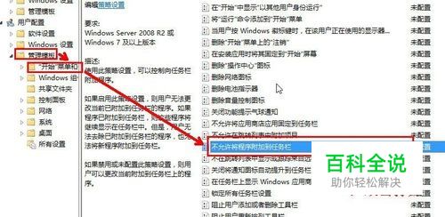 如图所示找到“不允许将程序附加到任务栏”策略;