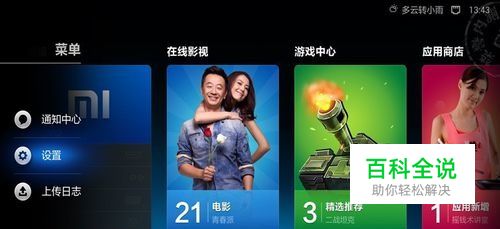 打开小米电视,按遥控器设置按钮,在左侧弹出的菜单上选择设置。