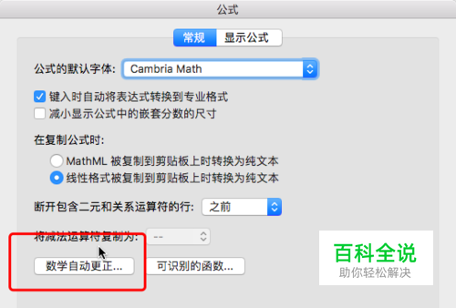 如下图,“公式选项”(windows自己找一下),点击“自动更正”,看见有替换,这样会很方便书写,而不用一个一个去找,记住常用的有利于提高速度哦!例如:\alpha \beta \epsilon \eta \gamma \delta \lambda \omega \psi常用希腊字母(当首字母大写就是大写的希腊字母) 运算符 +- -+ -> >= <= 存在 \exists 属于\in 无穷 \infty 因为\thereforee 输入完成后按空格即可实现替换,如下图