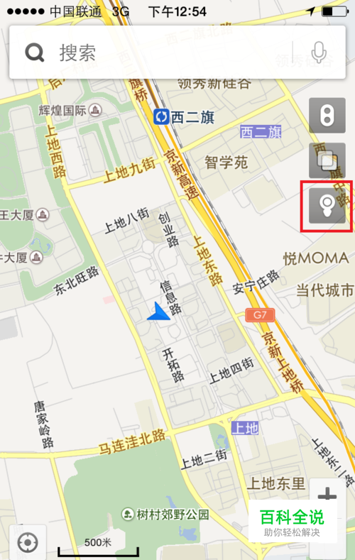 打开百度手机地图,点击“ 街景图标”,红色方框内的按钮