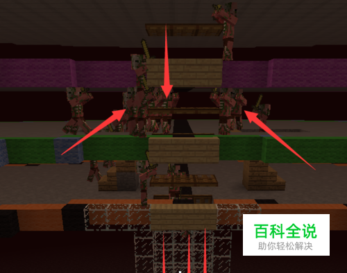 然后我们用弓箭对准其中一只猪人射过去,整个三层所有的猪人就都会被仇恨吸引,从我们设好的陷阱里面掉下去摔死。第一层的猪人会去第二层跳(这样做的目的是防止一层的猪人摔不死)