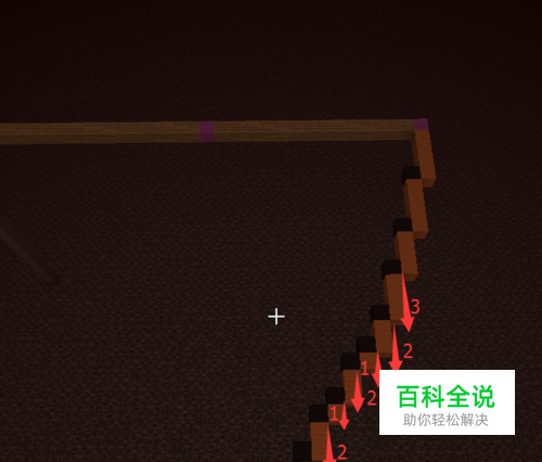然后再提高一格,第26格高用【紫色羊毛】(中心点)表示,然后向一个方向放【木头】长21格。第21格用【紫色羊毛】替换掉。